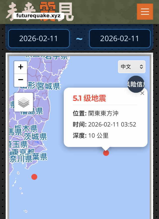 2月11日03:52(东京时间),日本关东东方冲(北纬35.6度,东经143.9度)发生了M5.1级地震,震源深度约10公里。