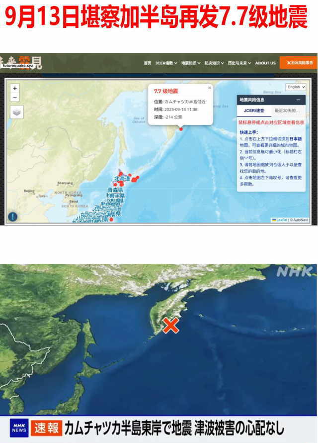 据JCERI监测数据,北京时间9月13日10时38分(东京时间11:38),俄罗斯堪察加半岛附近海域再次发生7.7级地震,震源深度10公里。这是继7月30日上午7時24分堪察加8.8級浅源地震后的又一次强震。
