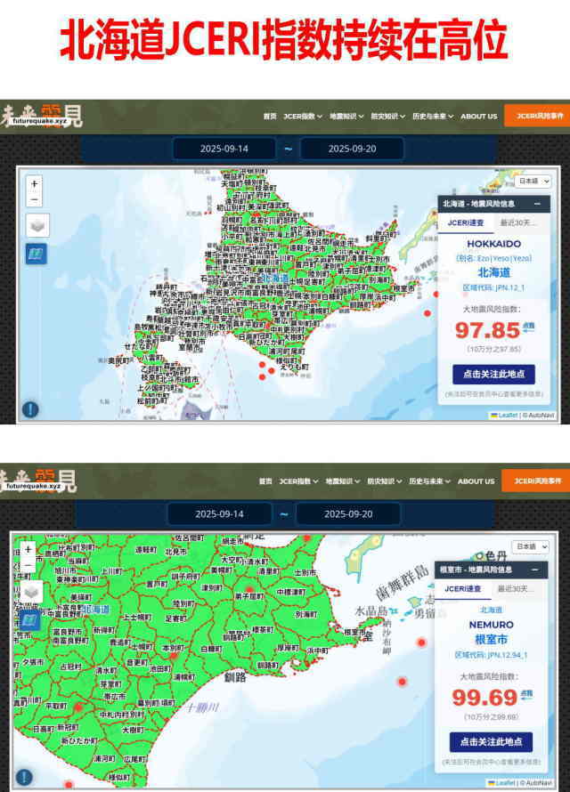 JCERI基于主流理论及模型,已在数月前较大幅度上调了北海道的大地震风险。根据后续监测数据,不排除进一步上调风险指数的可能。