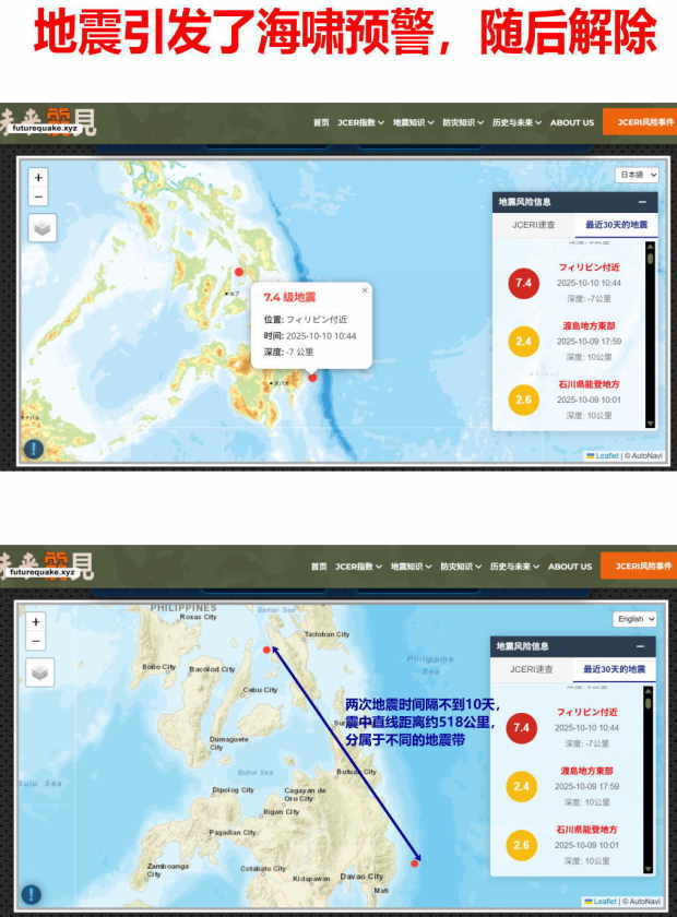 菲律宾和日本一样同处于环太平洋火山地震带,都是地震多发的国家。这两次地震时间隔不到10天,震中距离约518公里,分属于不同的地震带。