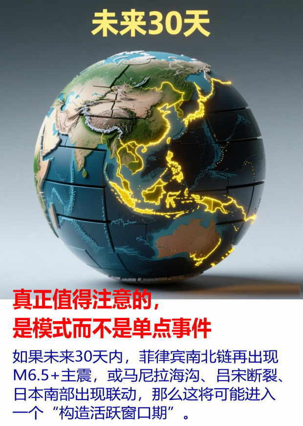 如果未来30天内,菲律宾南北链再出现M6.5 主震,或马尼拉海沟、吕宋断裂、日本南部出现联动,那么这将可能进入一个“构造活跃窗口期”。
