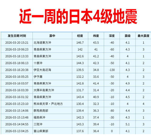 这一周日本4级以上地震共14次(图1),3级以上地震共9次(图2)。